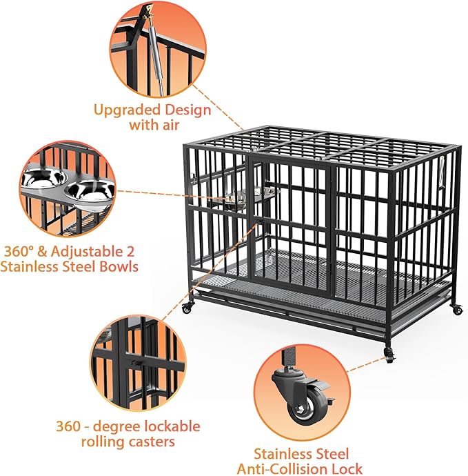LOVMOR 37" Heavy Duty Dog Crate with Wheels/Unique Air Lift Rod / 360° & Adjustable 2 Bowls, Extra Small Dog Crate
