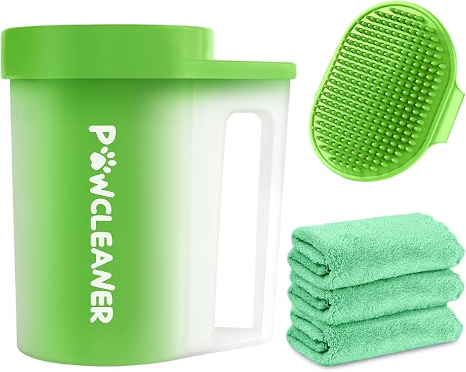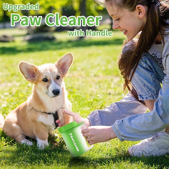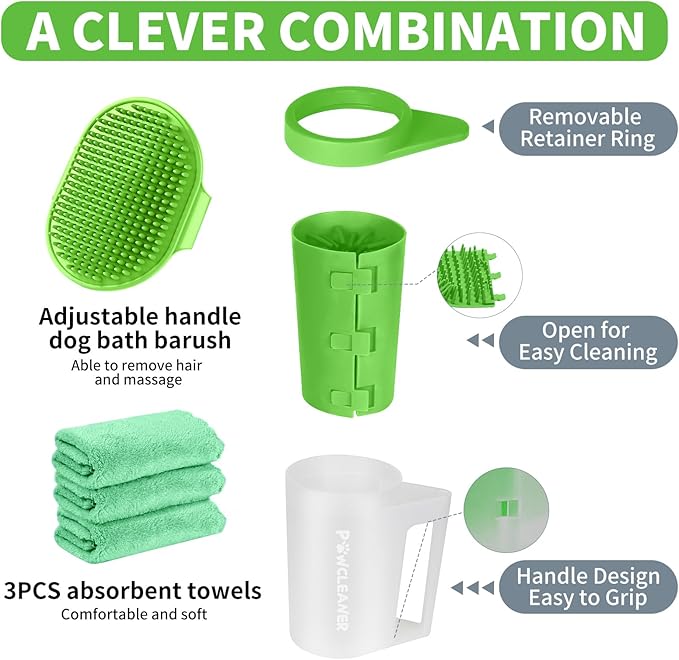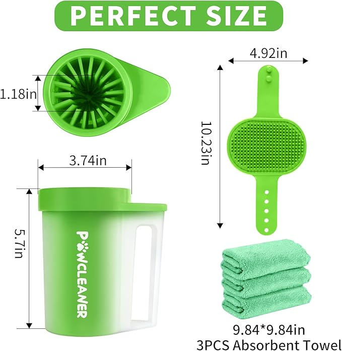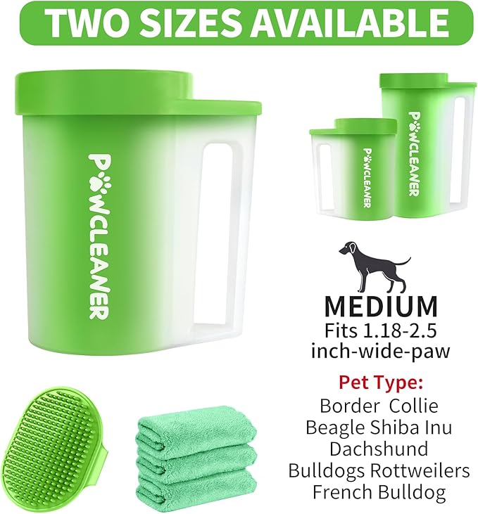 Paw Cleaner with Handle, Absorbent Towels & Adjustable Bath Brush for Medium Dogs (Buddy Muddy Pet Foot Washer, Green)