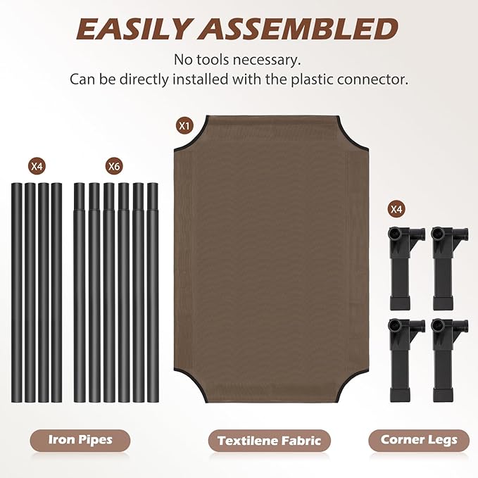 - Easy to Install: The cooling dog cot can be installed without the use of any tools, screws and can be installed directly with the plastic connector. It only takes a few minutes of your time, and presto! It's up and ready for your pet to enjoy in.
