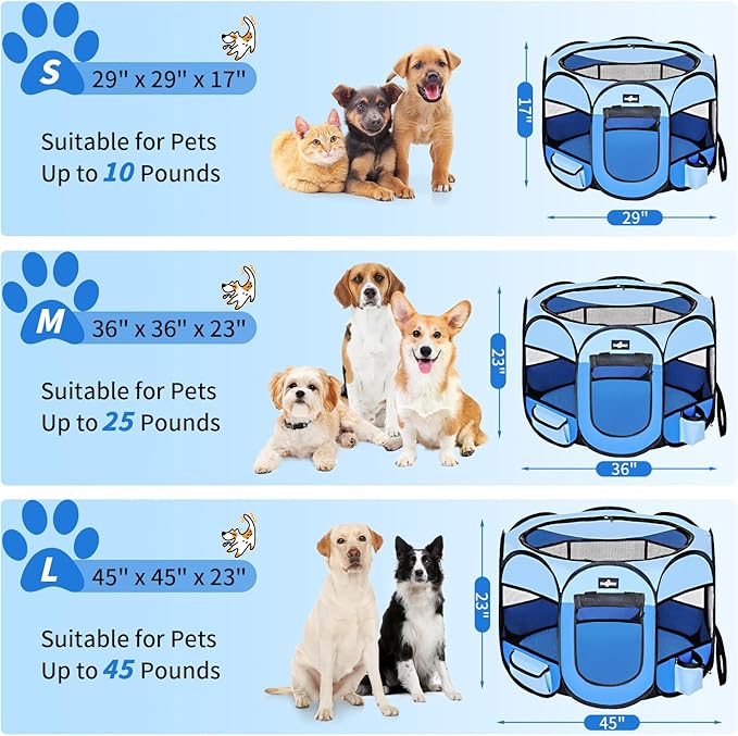 - 3 SIZE OPTIONS: Before purchasing a portable pet playpen, measure your pet. Small (29" x 29" x 17", suitable for pets up to 10 pounds); Medium (36" x 36" x 23", suitable for pets up to 25 pounds); Large (45" x 45" x 23", suitable for pets up to 45 pounds). All sizes of foldable dog playpen are manually measured with a 1-inch allowance for deviation. For any inquiries, feel free to reach out, our team is committed to assisting you.