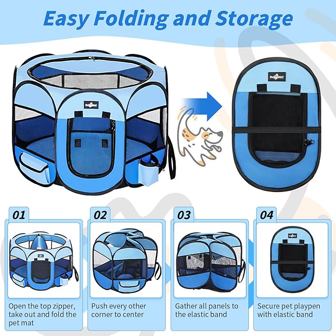 - PORTABILITY & STORAGE: Portable pet playpen comes with a convenient carrying case, folding into a compact size for easy storage in suitcases, car trunks, or closets. Perfect for indoor use, lawns, beaches, parks, traveling, and camping! Pet playpen for small dogs helps pets adapt to new environments while preventing other animals from entering, ensuring your pet's comfort in any setting.
