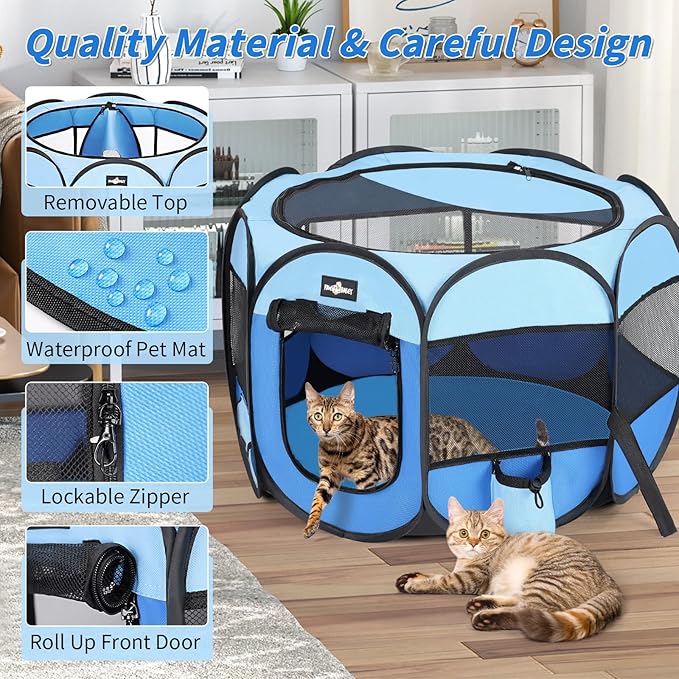 Foldable Pet Cat Playpen, Portable Pet Dog Playp en for Small Dog Cat, Puppy Kitten Pen with Free Carrying Case & Waterproof Pad, Pop up Pet Playpen for Indoor Outdoor Use