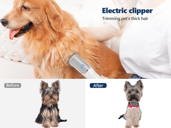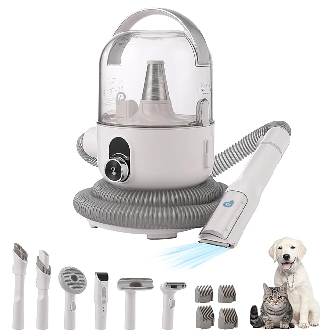 - 5 IN 1 PRO PET GROOMING KIT: This pet grooming kit with vacuum comes with 5 grooming tools. Use the daily grooming brush and the de-shedding tool to remove loose hair and eliminate tangles. The cleaning nozzle and cleaning brush can collect pet hair falling on the clothes, carpet and hard-to-reach areas. Make home grooming easy.