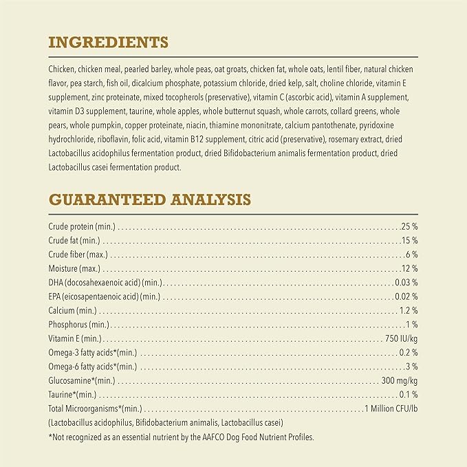 - Fiber from wholesome grains, vegetables and fruit, plus a blend of probiotics, help support digestive health in this kibble.