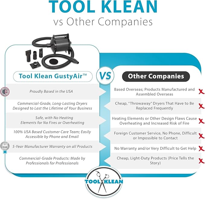 - ⚡【Invest in Your Business with Confidence】Order now to get your grooming business stocked with an essential piece of professional drying equipment! You’ll receive one industrial quality, wall mountable, stainless steel high velocity blow dryer for dogs. Also included is a washable, reusable filter and 5 hose attachments. You’ll have the peace of mind that your purchase is protected by Tool Klean, Inc.’s 5yr warranty. Any issues or concerns, our USA based team is here to help!