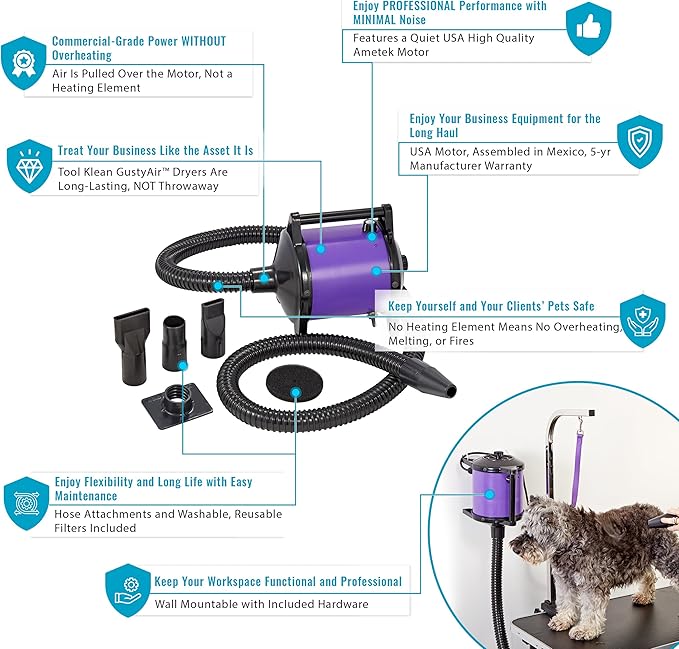 - ⚡【Enjoy Commercial-Grade Grooming Versatility】All GustyAir dryers are wall mountable and include reusable filters and several blower attachments. Choose the Pro Air II for maximum power and speed variability, without overheating, with its dual, individually controlled motors. Choose the Pro Air for commercial-grade power and durability at a moderate price-point. Or choose the GustyAir Mini as a great budget-conscious professional option for beginning groomers and small space businesses.
