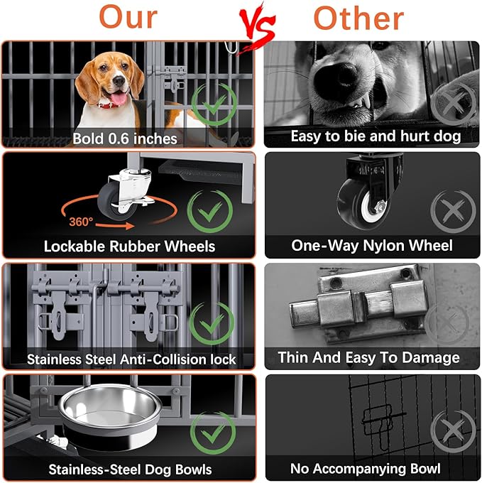 - ?�Practical & Easy to Move and Clean?‘The dog crate comes with four smooth rolling locking wheels for easy movement and fixation, you can easily move the crate to different positions as needed. The dog crate comes with a pull-out tray for easy removal and cleaning. It also comes with a safety latch to avoid your smart dog from opening the iron door, effectively protect your pet.