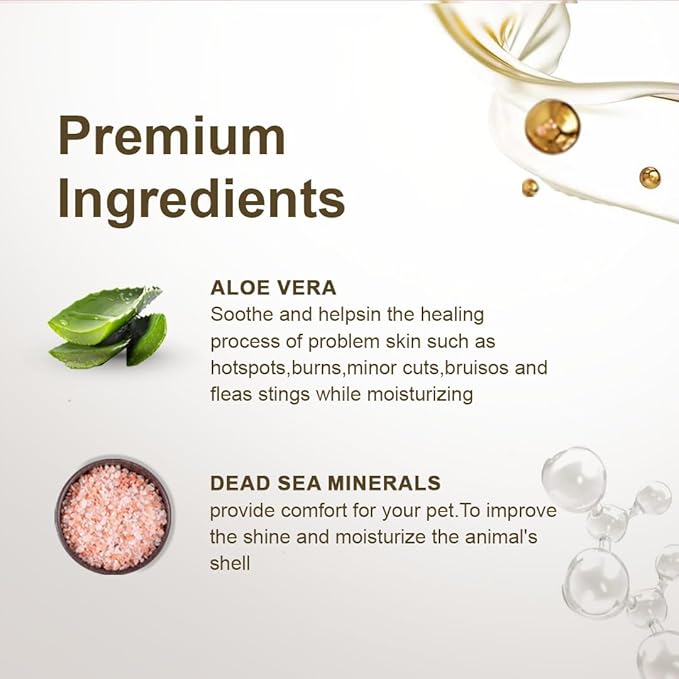 - [Dead Sea Minerals]: Infused with minerals sourced from the Dead Sea, it replenishes and nourishes your dog's skin, promoting a healthier and shinier coat.