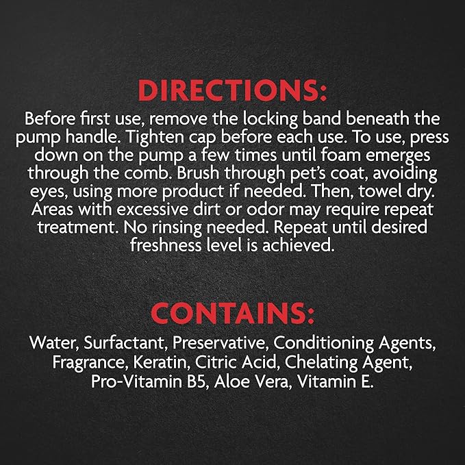 - RINSE-FREE FOAM COMB: Easy-to-use comb with foaming shampoo helps freshen your pet’s coat without water.
