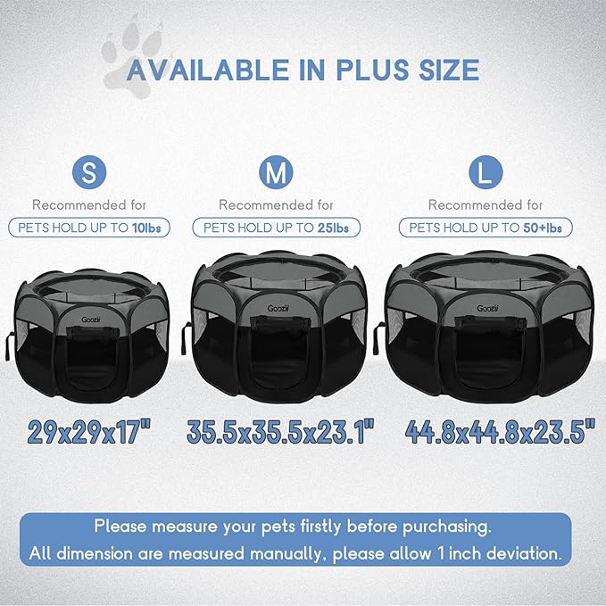 - 【Spacious & Comfort】This portable pet playpen keeps your cats or small dogs stay in this playpen enclosed and secure, spacious interior give more fun for your pet. The size of cat playpen is 29*29*17 inches, great for small animals up to 10 Lbs. There are 1 inch error range reasons for manual measurement. The Goozii pet playpen is also ideal gifts idea for dog cat lovers.