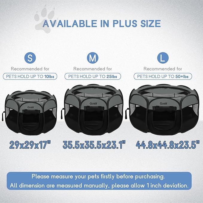 - 【Spacious & Comfort】: This dog playpen keeps your pet stay in this pet playpen secure, spacious interior give more fun for your pet. Size is 44.8*44.8*23.5 inches, great for small pets up to 50 LB. There are 1 inch error range because of technical issue.