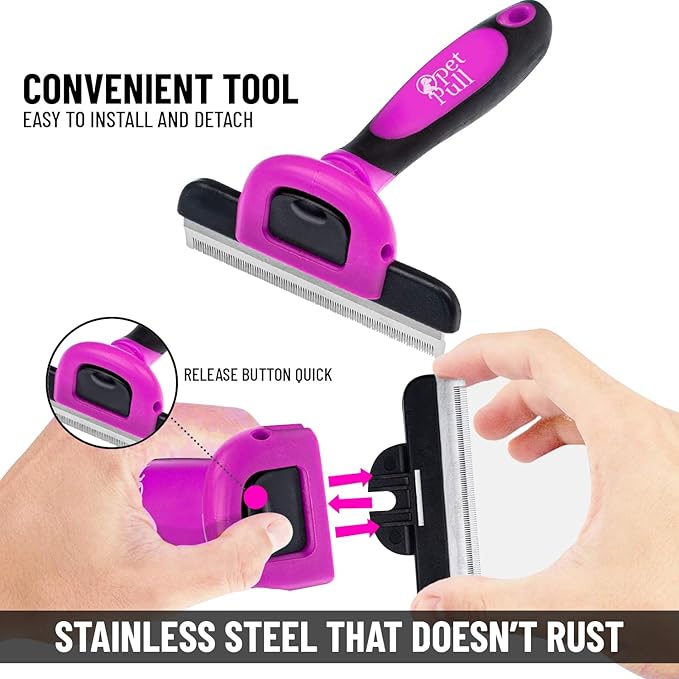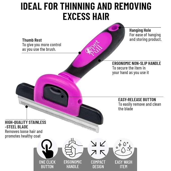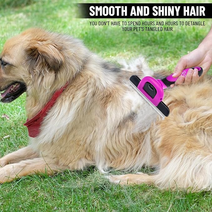 - 🐩 CLEANING IS A BREEZE - The dog hair remover fur deshedding brush has quick-release button for hassle-free cleaning and maintenance. Simply press the button to retract the teeth, making it easy to remove trapped hair and debris from the comb.