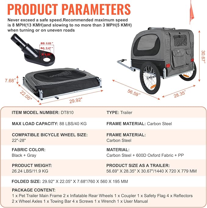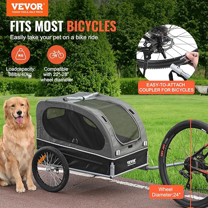 - Designed for Your Bike: Our dog bike trailer is the perfect companion for your bike rides. It easily attaches to most bikes, letting you take your furry friend for a spin. With a load capacity of 88 lbs/40 kg, it's a breeze to transport your beloved pet. Fits bike wheel diameters of 22-28 inches.