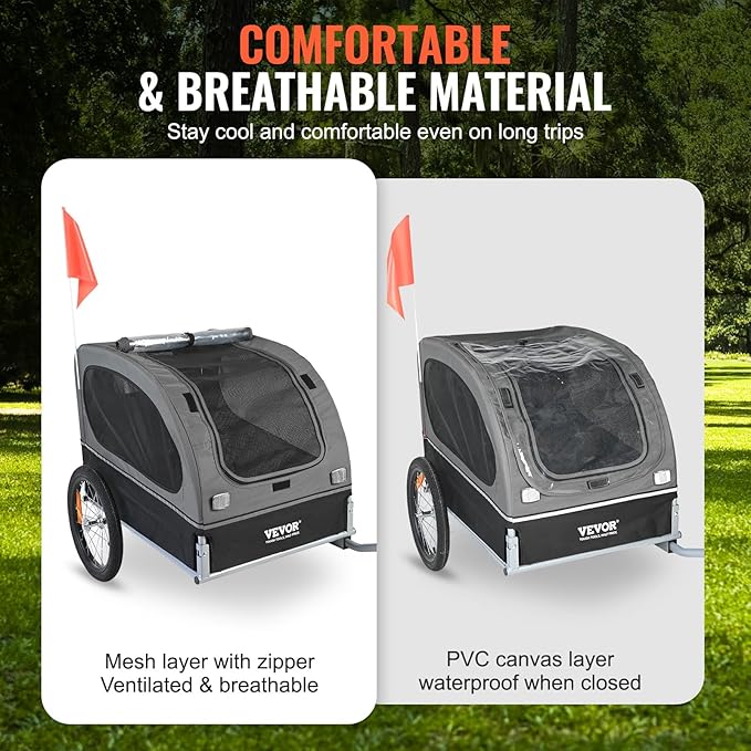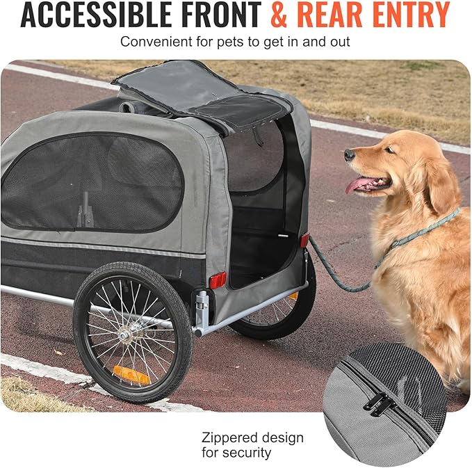 - Easy In, Easy Out: Getting your pet in and out is a breeze with this pet bike trailer. The transparent front door provides protection from wind and rain while ensuring excellent ventilation. Your pet can hop in through the zippered front and rear doors and even stick their head out, all with ease.