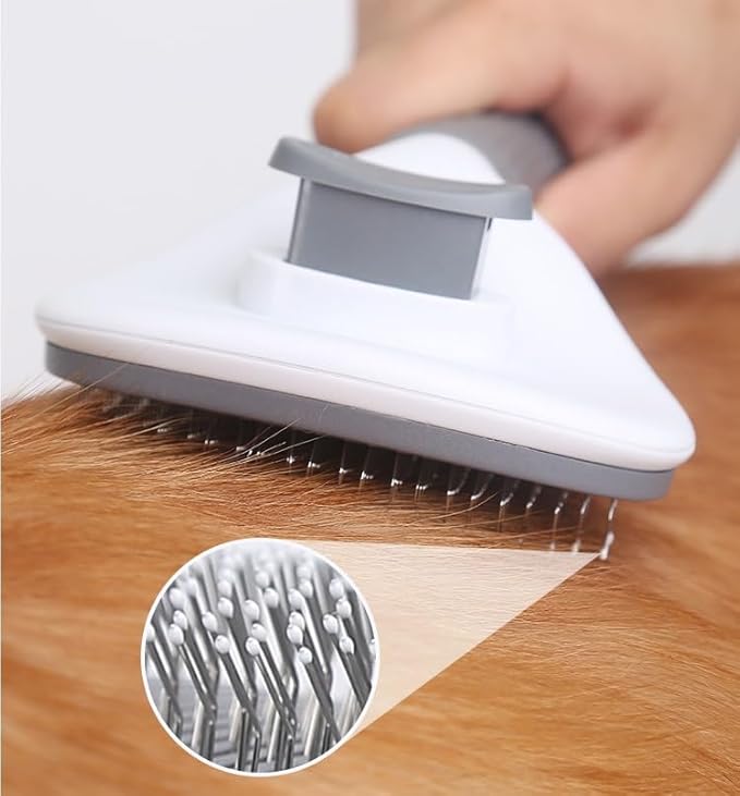 - 2-in-1 Self-Cleaning Pet Brush: The Pet Brush for Cats and Dogs is made of high-quality ABS and nylon, which is soft and comfortable. It has a unique self-cleaning design, which is convenient for pet owners to clean the hair on the brush easily.
