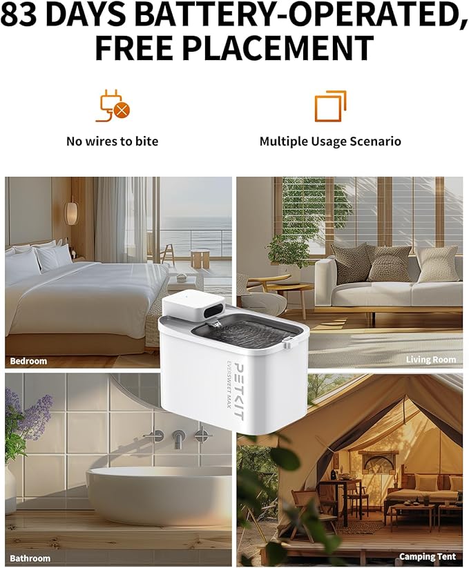 - Wireless Cat Drinking Fountain: PETKIT new upgraded wireless water dispenser, no need to plug in, you can place it anywhere: kitchen, bedroom, balcony, etc., bring you a new feeling; 5000mAh high-capacity battery, service life up to 83 days! No more worry about your cat or dog running out of water during power outages or short trips! When the fountain is short of water, the pump will automatically stop working to prevent the device from burning out.