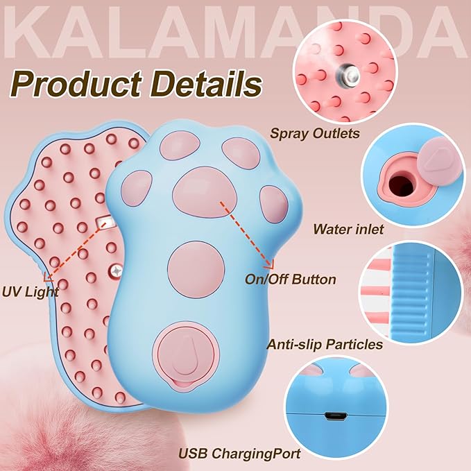 Cat Steam Brush for Shedding, 4 in 1 Steamy Cat Brush with Cleanser, Dog Massage Grooming Brush with Release Button, Pet Hair Cleaning Misting Comb for Kitten(Blue Paw)