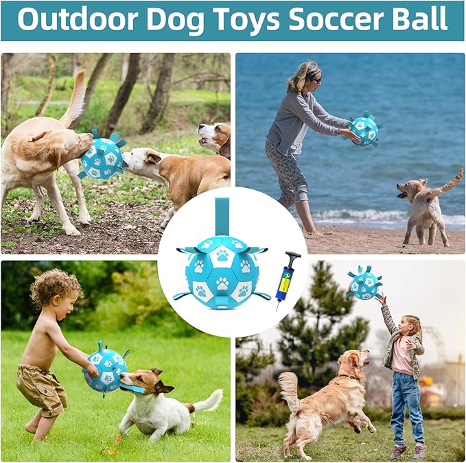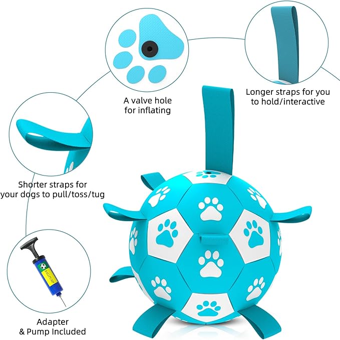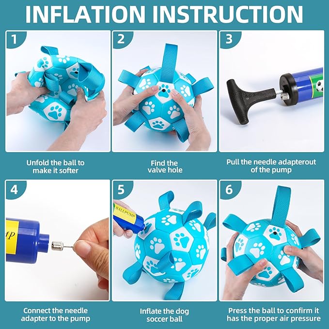 - ⚽Pump & Needle Adapter Included: The herding balls for dogs comes deflated. There's a a needle point adapter and a pump inside as well while other items in the same market only include a ball needle. The soccer ball dog toy is 8 inches in diameter, perfect for large breeds, not for aggressive chewers.