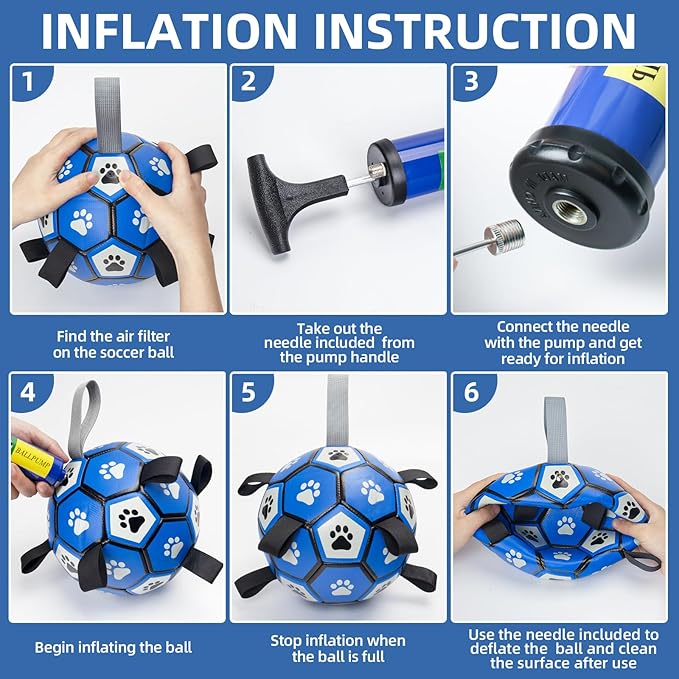 - ⚽🐶Pump & Needle Adapter Included: The herding balls for dogs comes deflated. There's a a needle point adapter and a pump inside as well while other items in the same market only include a ball needle. The soccer ball dog toy is 9 inches in diameter, perfect for extra large breeds, not for aggressive chewers.