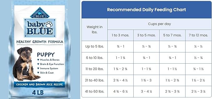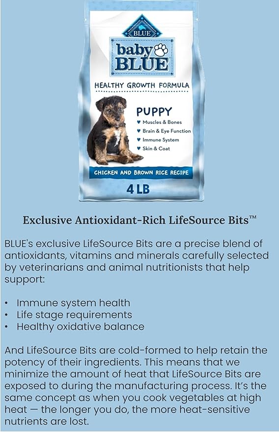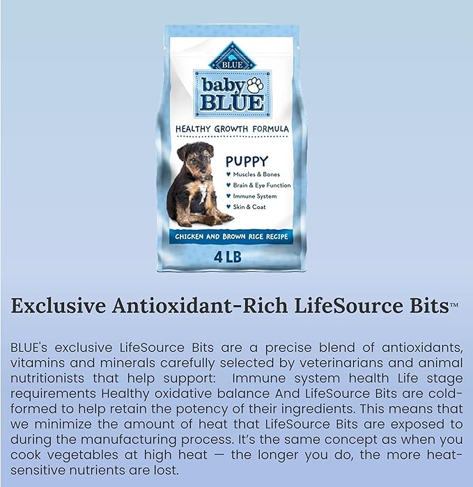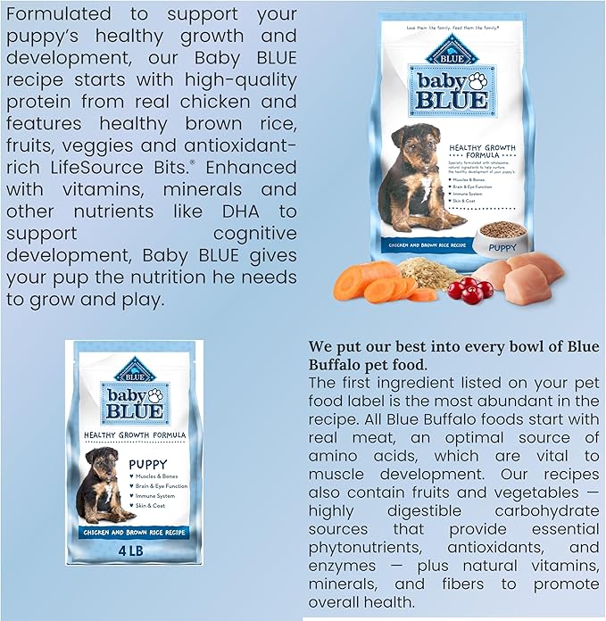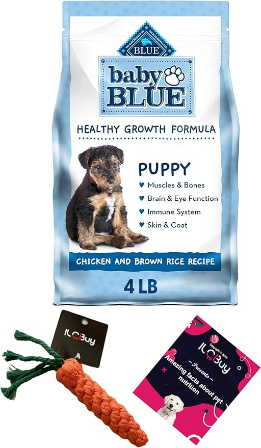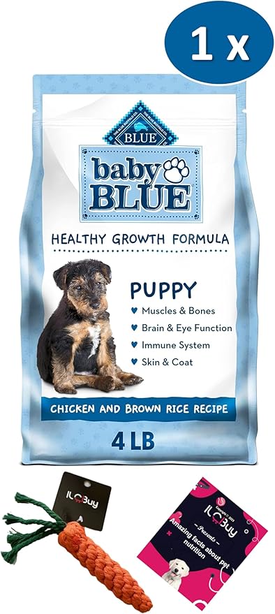 Baby Blue Puppy Food Bundle, Includes 01 Bag(4 LB) Baby Blue Healthy Growth Formula with Chicken and Brown Rice,01 Carrot Dog Toys and 01 Booklet About Pet Nutrition.