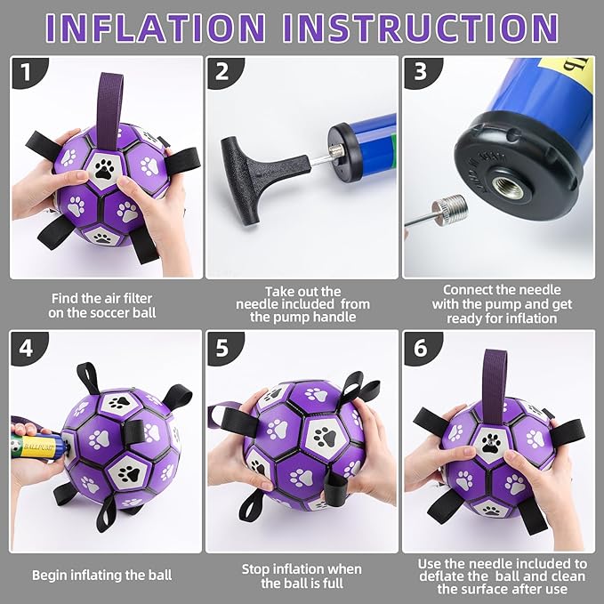 - ⚽Pump & Needle Adapter Included: The herding balls for dogs come deflated. There's a needle point adapter and a pump inside as well while other items in the same market only include a ball needle. The soccer ball dog toy is 6 inches in diameter, perfect for small medium breeds, not for aggressive chewers.