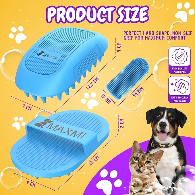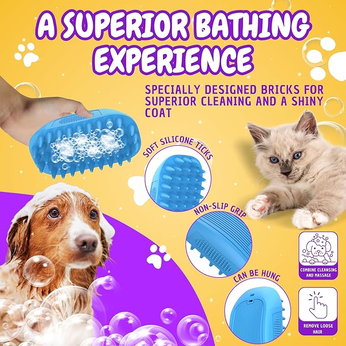- 🐶【Easy Cleaning & Deep Scrubbing】- the dog shampoo brush offers a deep clean, removing dirt and loose hair. Designed to fit both long and short haired dogs. Soft silicone tips provide a soothing massage that stimulates circulation, promoting skin and coat health without damaging your pet's skin.
