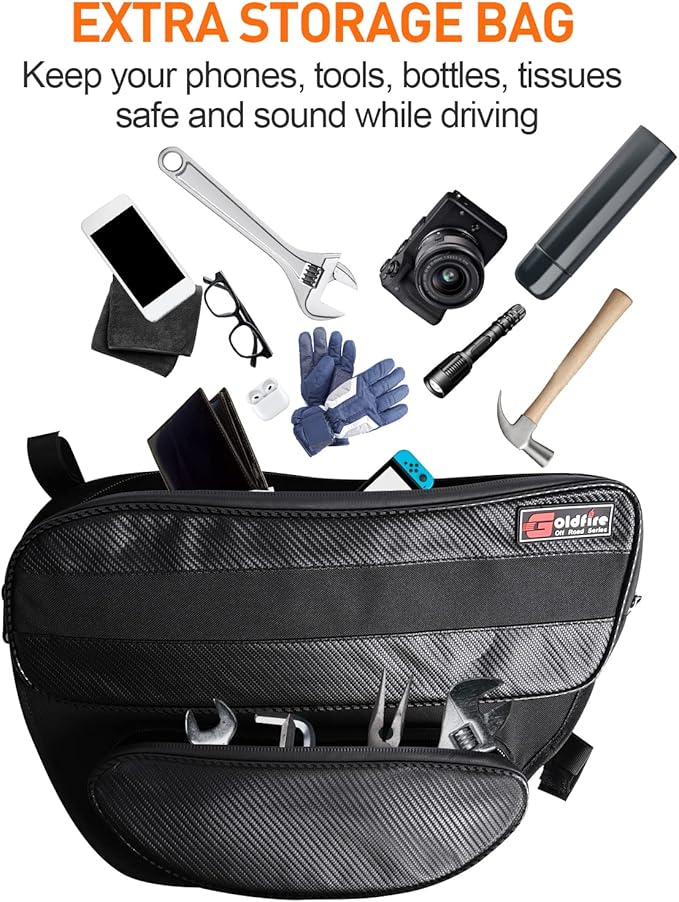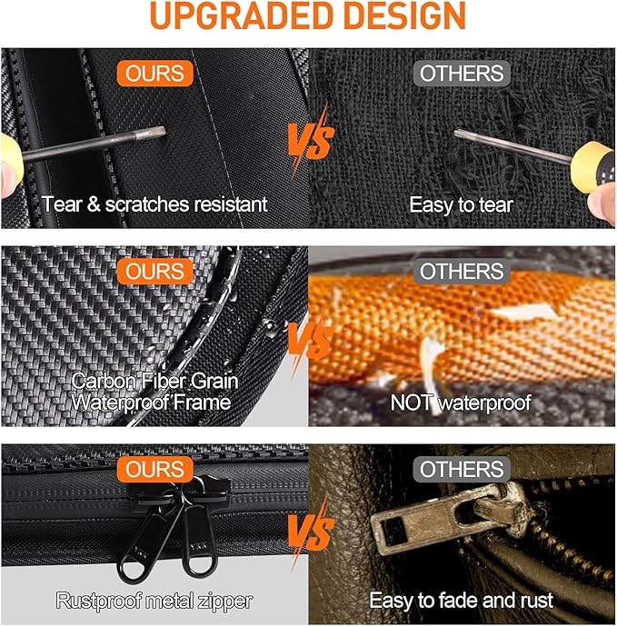 - WATERPROOF MATERIAL: Our upper and lower door bag set are made from heavy duty 1680D oxford fabric and carbon fiber pattern vinyl. Not only waterproof, but also the fabric process adopts the cross knitting method, which is wear and tear resistance, anti-deformation, does not fade and easy to care. The inner lining is made of waterproof smooth fabric to better protect tools.Waterproof zipper with cover effectively keep water, mud, sand out.