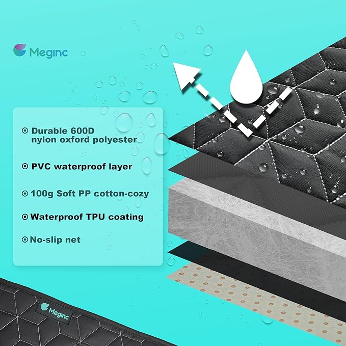 - Sturdy Material : HEAVYDUTY! HEAVYDUTY! HEAVYDUTY!Meginc dog car seat cover is made of 600D Oxford cloth, 100g soft PP cotton, 210D polyester fabric, 100% waterproof TPU and PVC anti-slip mesh. A thick bench seat cover can mitigate the damage of your vehicle and protect carpet, upholstery from unpleasantries such as dog hair, urine, or vomit, moreover our protectors also providing a familiar, comfortable and safety space for your pets during the road travel