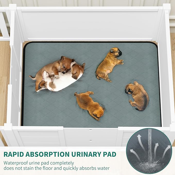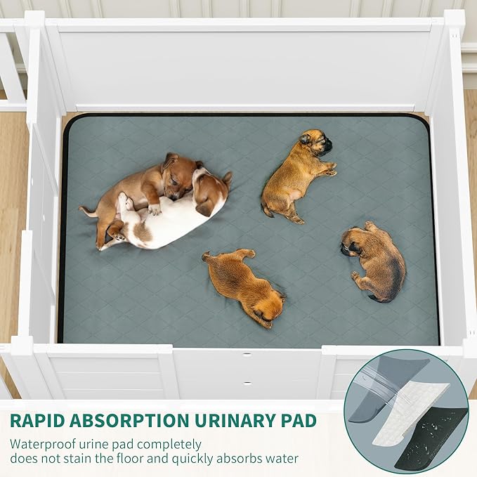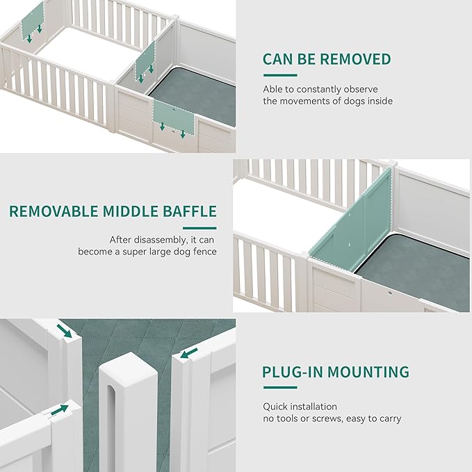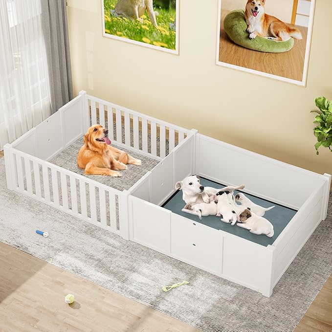 - Multi-Functional 2-Room Design with Adjustable Dividers:Create separate zones for birthing, weaning, or play with removable dividers. Remove a panel for mother dog access,while tall rails and non-slip mat keep puppies secure. Ideal for breeding, playpen, or cat corral.