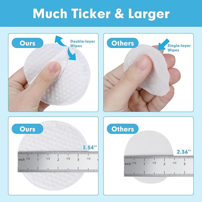 - THICKER AND LARGER: With a diameter of 3.54", these wipes are 1.5 times than regular wipes, offering excellent softness and size. Our double-layer dog eye wipes are made from 100% premium cotton, ensuring they are soft, skin-friendly, and safe for long-term use on your pet's skin and fur. The unique pearl pattern enhances cleaning effectiveness, and each wipe is infused with ample moisture.