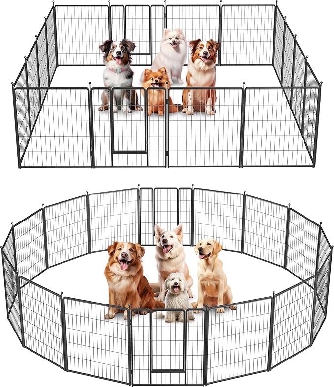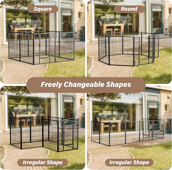 - 【Easy Assemble & DIY Shapes】Each panel is a separate piece. The panels could be assembled in just a few minutes without tools. You could DIY the dog pen to any shape you need, like square, rectangle, round, etc according to your house, garden or lawn.