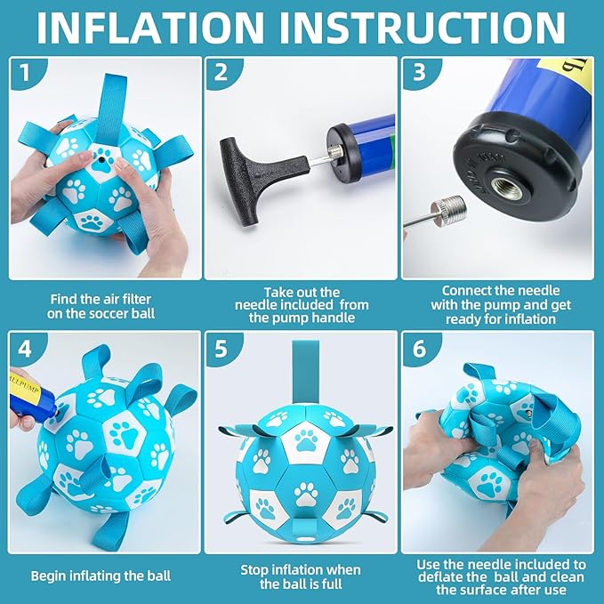 - ⚽Pump & Needle Adapter Included: The herding balls for dogs come deflated. There's a needle point adapter and a pump inside as well while other items in the same market only include a ball needle. The soccer ball dog toy is 9 inches in diameter, perfect for small medium breeds, not for aggressive chewers.