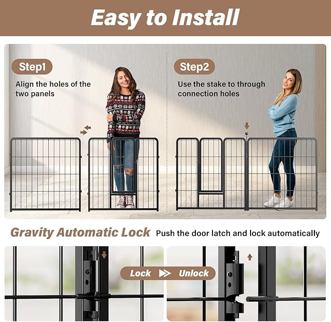 - 【Upgraded Dog Playpen】Dog playpen indoor adopts gravity door lock design, much safer and more convenient. Made of heavy duty metal panels and stakes with black coating, non-toxic, anti-rust. Ensures long time use no matter indoor or outdoor.