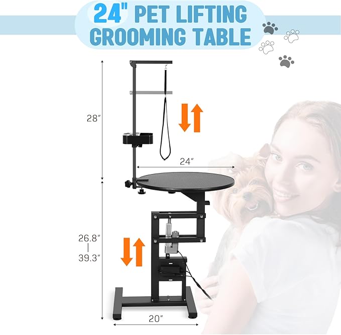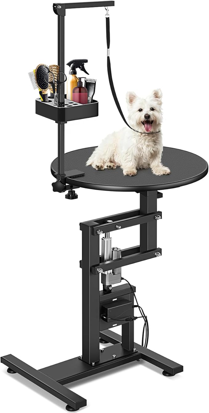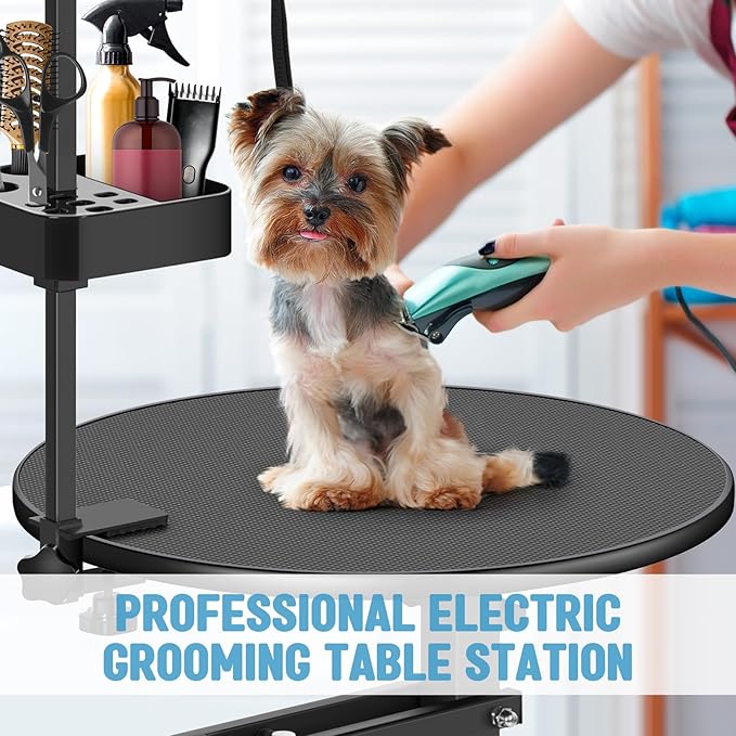 - Electric Lifting Grooming Table: The electric lift adjusts the height from 26.8 inches to 39.3 inches smoothly and quietly; no need to bend down, allowing you to work comfortably and avoid back pain, and groom your pets easily. Features leg levels for uneven floors and high arms for added stability to prevent accidental damage or injury.