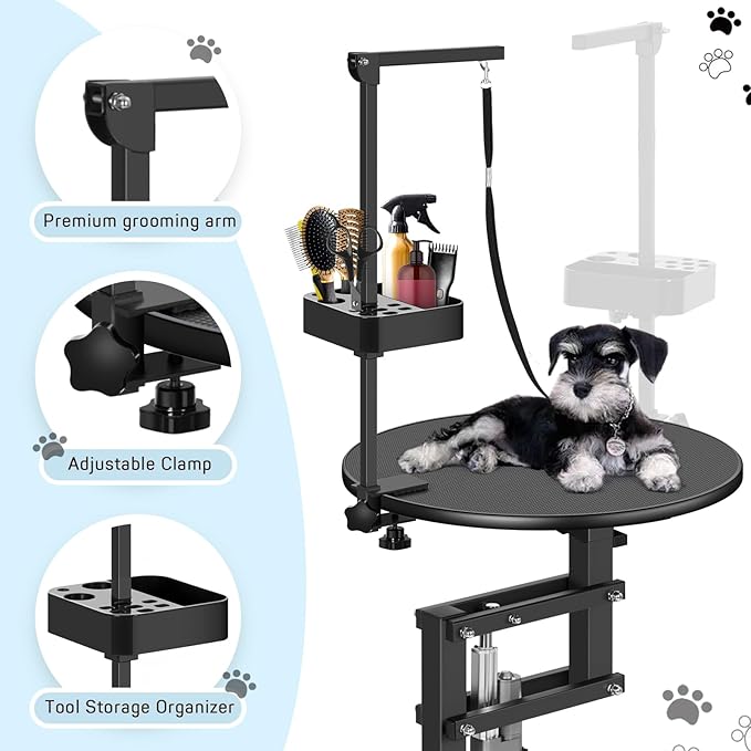 PullaFun 24" Electric Dog Grooming Table, Adjustable Overhead Arm Dog Grooming Table, Rotating Desktop Pet Grooming Table, Suitable for Household Dogs, Non-Slip Table, Black