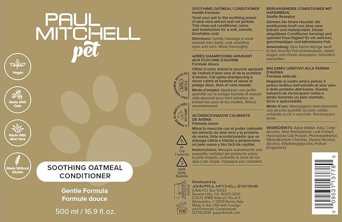 - Recommended Uses For Product : Gently massage a small amount into damp coat, avoiding eyes and ears. Rinse thoroughly. Towel-dry and comb through. For best results, use with Soothing Oatmeal Shampoo, Soothing Oatmeal Conditioning Spray and Soothing Oatmeal No-Rinse Shampoo Foam. Gently massage a small amount into damp coat, avoiding eyes and ears. Rinse thoroughly. Towel-dry and comb through. For best results, use with… See more