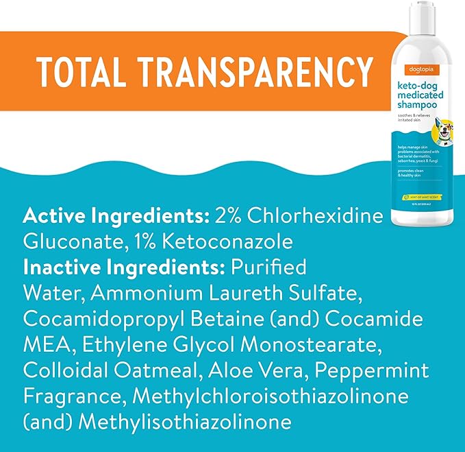 - Formulated to provide a therapeutic bath with a hint of mint scent, Dogtopia’s Keto-Dog Shampoo washes away the dirt and irritants that can lead to skin conditions. The added benefit of colloidal oatmeal helps to soothe and moisturize.