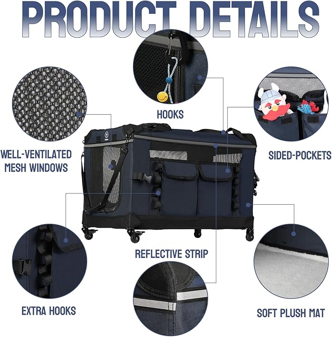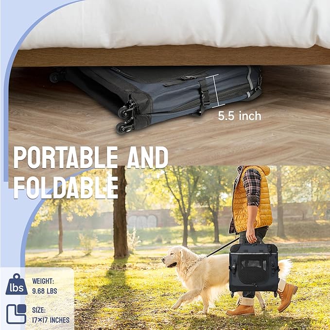 - ?�EASE OF ROLLING?‘The rolling travel dog crate with detachable wheels makes it easy for vet visits, long journeys, shopping, or walks ect.. The 360° rotating dual front wheels ensure smooth, quiet, and easy movement in any direction. Additionally, the rolling dog crate features the carrying handles and adjustable shoulder strap for convenient transport.