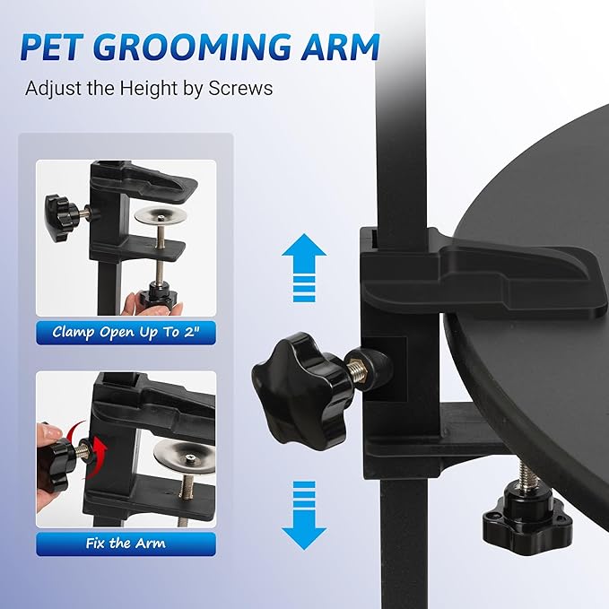 - ๐๐ฎ๐ฌ๐ญ๐จ๐ฆ๐ข๐ณ๐๐๐ฅ๐ ๐๐๐ข๐ ๐ก๐ญ ๐๐๐ฃ๐ฎ๐ฌ๐ญ๐ฆ๐๐ง๐ญ: Height of dog grooming arm can be adjusted from 18" to 35", and fits tables up to 2" thick. 2-knob of pet grooming stand design lets you easily adapt the height to different dog sizes - Small and Medium.