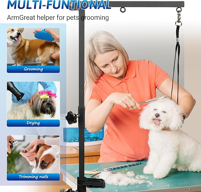 - ๐๐๐ซ๐ฌ๐๐ญ๐ข๐ฅ๐ ๐๐๐ญ ๐๐ซ๐จ๐จ๐ฆ๐ข๐ง๐ ๐๐จ๐จ๐ฅ: dog grooming arm is perfect for bathing, drying, hair cutting, and nail trimming both at home and in a professional setting. It's made with high-quality metal to ensure its durability and longevity.