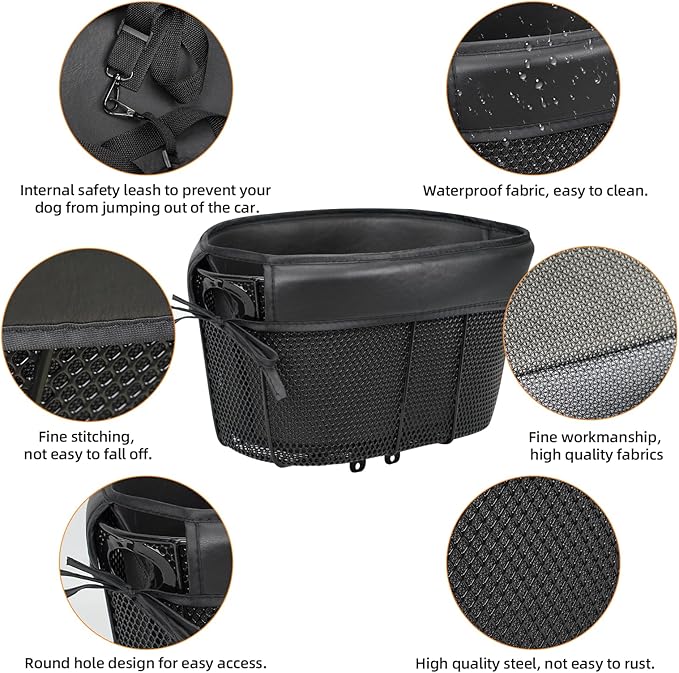 - Safety Design: Safety takes priority in our bike dog carrier. It comes equipped with adjustable safety leash to keep your pet safely inside. The bottom breathable pad makes the dogs more comfortable in the dog bike basket, sitting inside without feeling stuffy, the pad is washable and easy to clean.