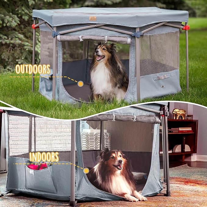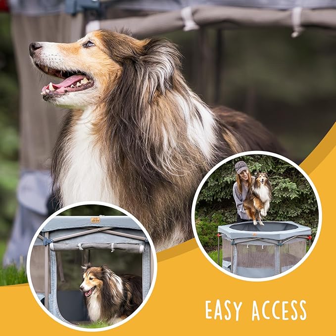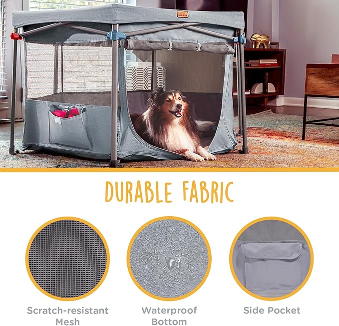- FOLDABLE & PORTABLE: The CANINE CANYON playpen folds in seconds and includes a carrying bag for easy transport and storage.