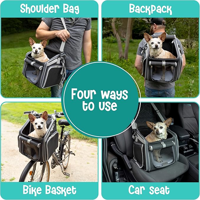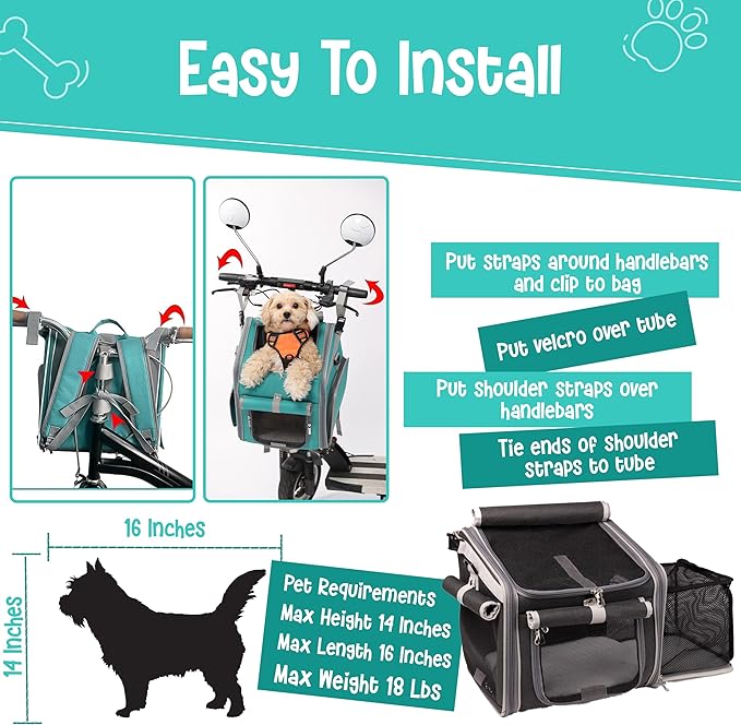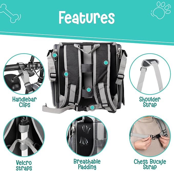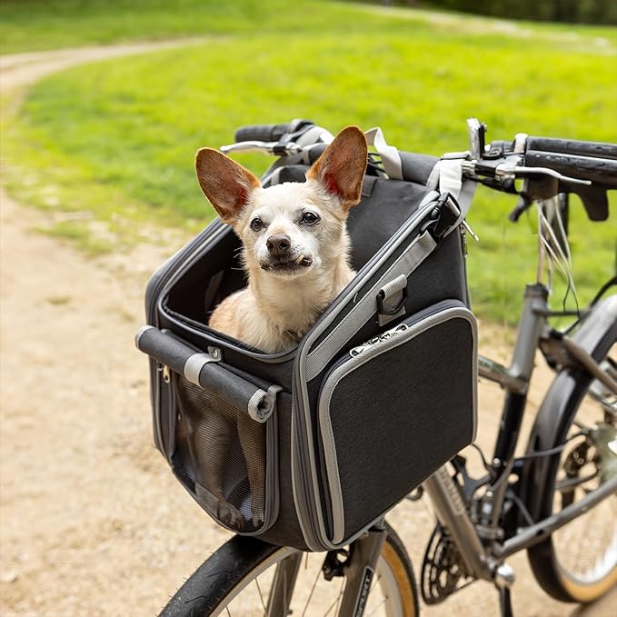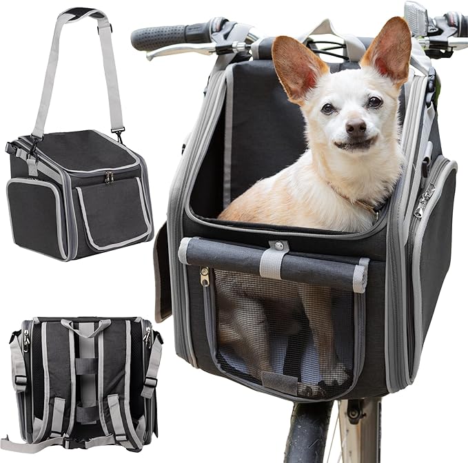 - [TAKE YOUR PET EVERYWHERE] This bag works great on the bicycle but has so many other uses. The backpack straps allow you to take it off the bike and carry your dog everywhere you go. This also comes with a shoulder strap so you have more ways to carry your furry friend and can even be used as a car seat.