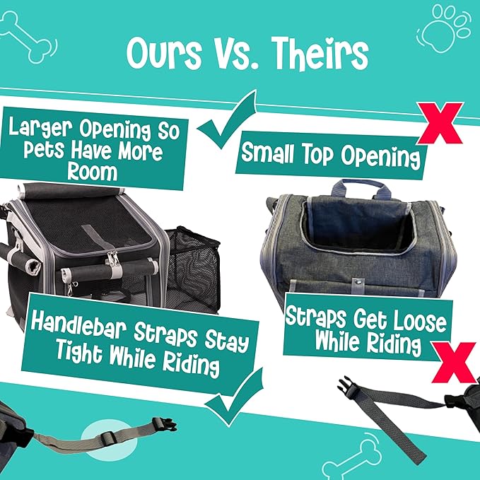 - [SAFE & COMFORTABLE] This bag was designed with your pets comfort and safety in mind. There are two leash options to help keep your pet safe. The handlebar straps are uniquely designed to prevent the bag from getting loose while riding. Larger top opening prevents your pets neck or body from being hurt while going over bumps. Large ventilated sides and padded interior ensure maximum comfort for your pet.