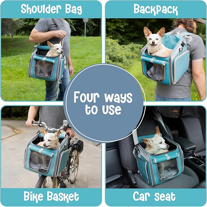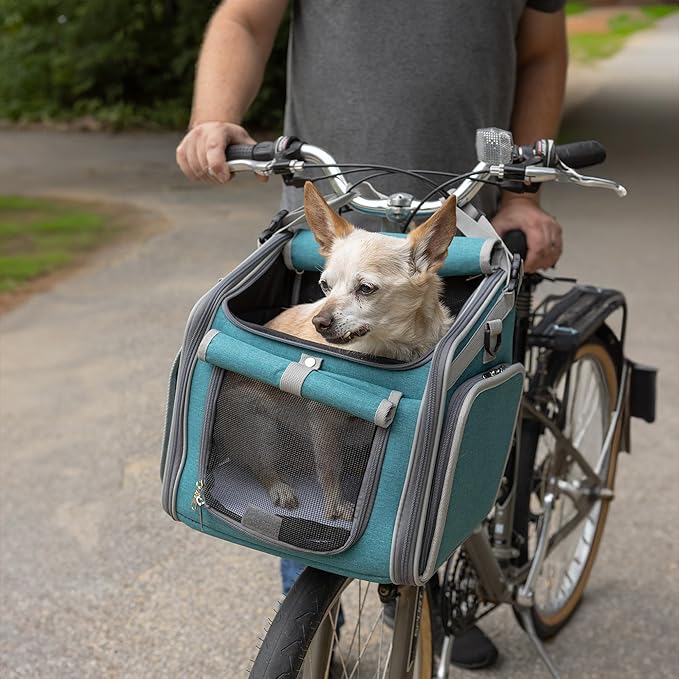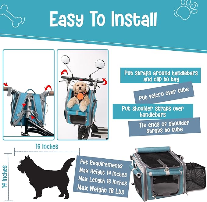 - [TAKE YOUR PET EVERYWHERE] This bag works great on the bicycle but has so many other uses. The backpack straps allow you to take it off the bike and carry your dog everywhere you go. This also comes with a shoulder strap so you have more ways to carry your furry friend and can even be used as a car seat.