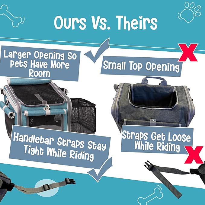 - [SAFE & COMFORTABLE] This bag was designed with your pets comfort and safety in mind. There are two leash options to help keep your pet safe. The handlebar straps are uniquely designed to prevent the bag from getting loose while riding. Larger top opening prevents your pets neck or body from being hurt while going over bumps. Large ventilated sides and padded interior ensure maximum comfort for your pet.