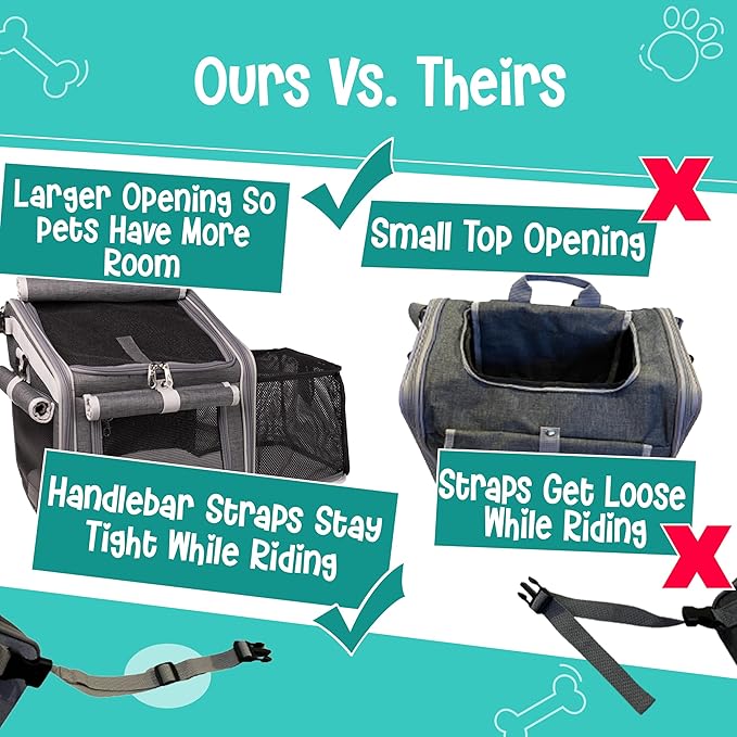 - [SAFE & COMFORTABLE] This bag was designed with your pets comfort and safety in mind. There are two leash options to help keep your pet safe. The handlebar straps are uniquely designed to prevent the bag from getting loose while riding. Larger top opening prevents your pets neck or body from being hurt while going over bumps. Large ventilated sides and padded interior ensure maximum comfort for your pet.
