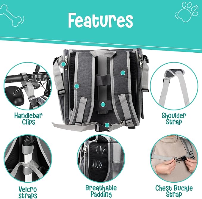 - [TAKE YOUR PET EVERYWHERE] This bag works great on the bicycle but has so many other uses. The backpack straps allow you to take it off the bike and carry your dog everywhere you go. This also comes with a shoulder strap so you have more ways to carry your furry friend and can even be used as a car seat.