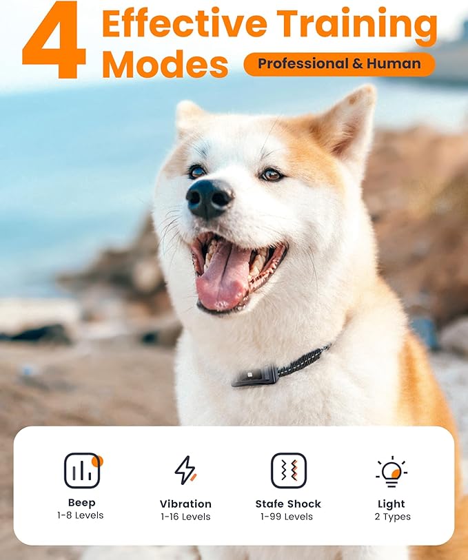 - 【4 HUMANE & SAFE TRAINING MODES】: The dog shock collar with remote control featuring 3 training modes and a distance remote light mode. You can choose from 8 sound frequencies, 1-16 vibration levels, and humane 0-99 shock levels tailored to your dog's needs. The remote light of this training collar ensures visibility during night walks