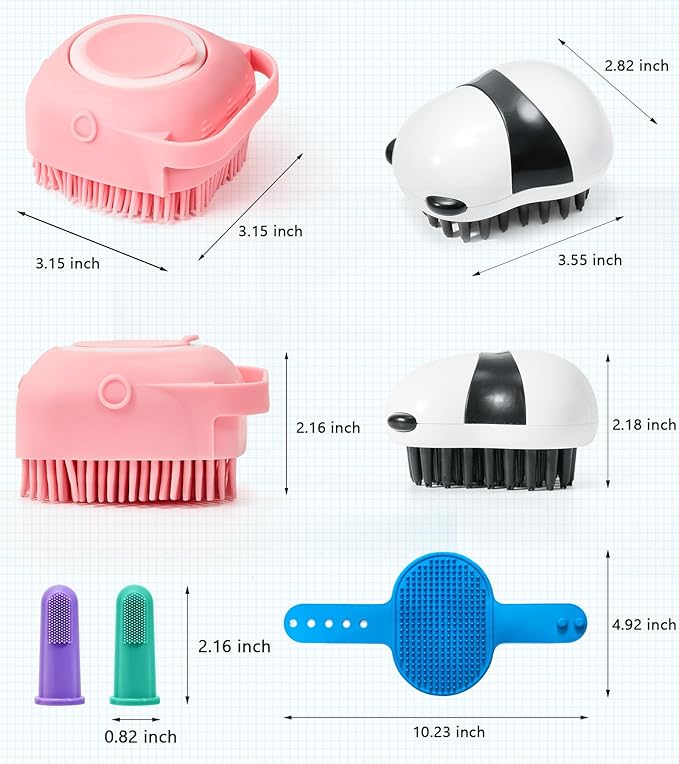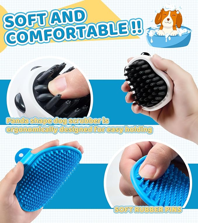 - With 2 additional Cute Panda Shape & Adjustable Dog Scrubber: This dog scrubber for bath is ergonomically designed with a perfect adjustable ring handle, which can adapt to different sizes of hands, easy to hold.The panda shape dog scrubber is ergonomically designed for easy holding while removing hair easily with three-point soft rubber. 2 dog bath brush scrubbers are used together, it can effectively remove pet hair while bathing or massaging, giving your pet an excellent bathing experience